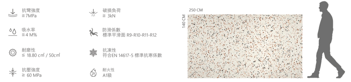 水磨石板片皆生產製作自義大利,原料為大理石顆粒、波特蘭水泥與水